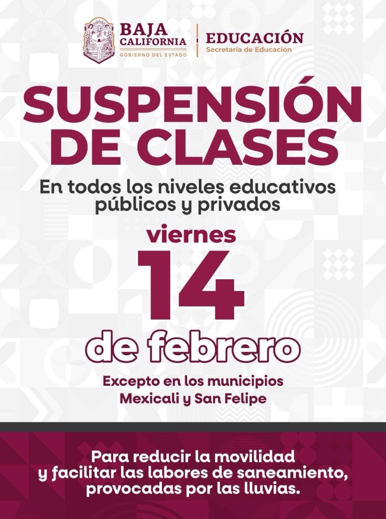 📍EL SISTEMA EDUCATIVO ESTATAL INFORMA LA SUSPENSIÓN DE CLASES EN TODOS LOS NIVELES EDUCATIVOS PARA TURNO MATUTINO ESTE VIERNES 14 DE FEBRERO, PARA TECATE, ENSENADA, TIJUANA, ROSARITO Y SAN QUINTÍN A EXCEPCIÓN DE MEXICALI Y SAN FELIPE QUE VAN A LABORAR CON NORMALIDAD.