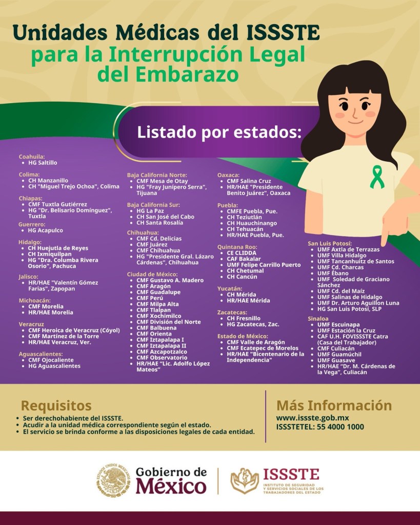 El Instituto de Seguridad y Servicios Sociales de los Trabajadores del Estado (ISSSTE) compartió una lista de unidades médicas en las que se garantiza la aplicación del procedimiento para la Interrupción Legal del Embarazo (ILE), en 21 entidades del país.