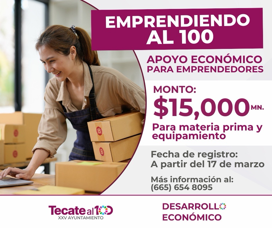 Con el firme compromiso de fortalecer la economía local y apoyar a los nuevos emprendedores, el Gobierno Municipal de Tecate, encabezado por el alcalde Román Cota Muñoz, ha lanzado el programa de apoyo económico «Emprendiendo al 100», a través de la Dirección de Desarrollo Económico.