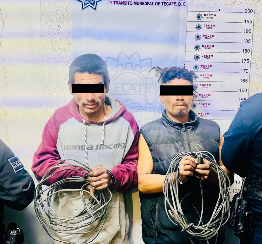 Ambos se retiran del lugar con los cables en la mano, dirigiéndose hacia la calle Primera con dirección al oriente. Posteriormente, ingresan a un terreno baldío y dejan los cables a un costado de la barda de bloque de la farmacia ubicada en la intersección de calle Primera y Tecate, continuando su trayecto sobre calle Primera en dirección al oriente.