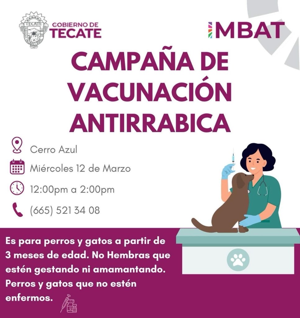 Como parte del compromiso con el bienestar animal y la salud pública, el Instituto Municipal de Bienestar Animal (IMBAT) del Gobierno de Tecate invita a la ciudadanía a participar en la Jornada Gratuita de Vacunación Antirrábica, que se llevará a cabo este miércoles 12 de marzo en Cerro Azul.
