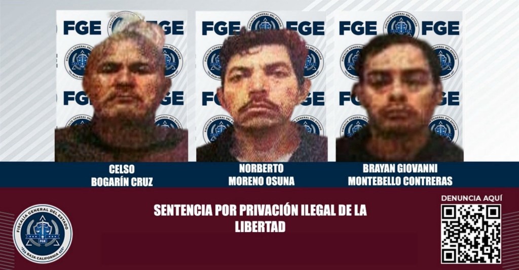 La Fiscalía Regional de Tijuana informa que, mediante un procedimiento abreviado, se obtuvo sentencia condenatoria en contra de Brayan Giovanni Montebello Contreras, Norberto Moreno Osuna y Celso Bogarín Cruz, quienes fueron declarados culpables del delito de privación ilegal de la libertad agravada en perjuicio de una víctima del sexo masculino.