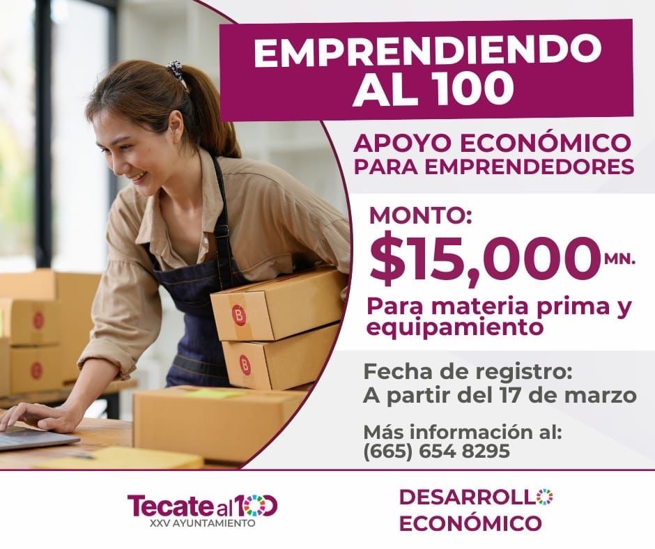 Tecate, Baja California, a 14 de marzo de 2025. – Con el firme compromiso de fortalecer la economía local brindando oportunidades a quienes buscan salir adelante con esfuerzo y dedicación, el Gobierno de Tecate, lanza la convocatoria “Emprendiendo al 100”, un programa de apoyo económico dirigido a emprendedores locales.
