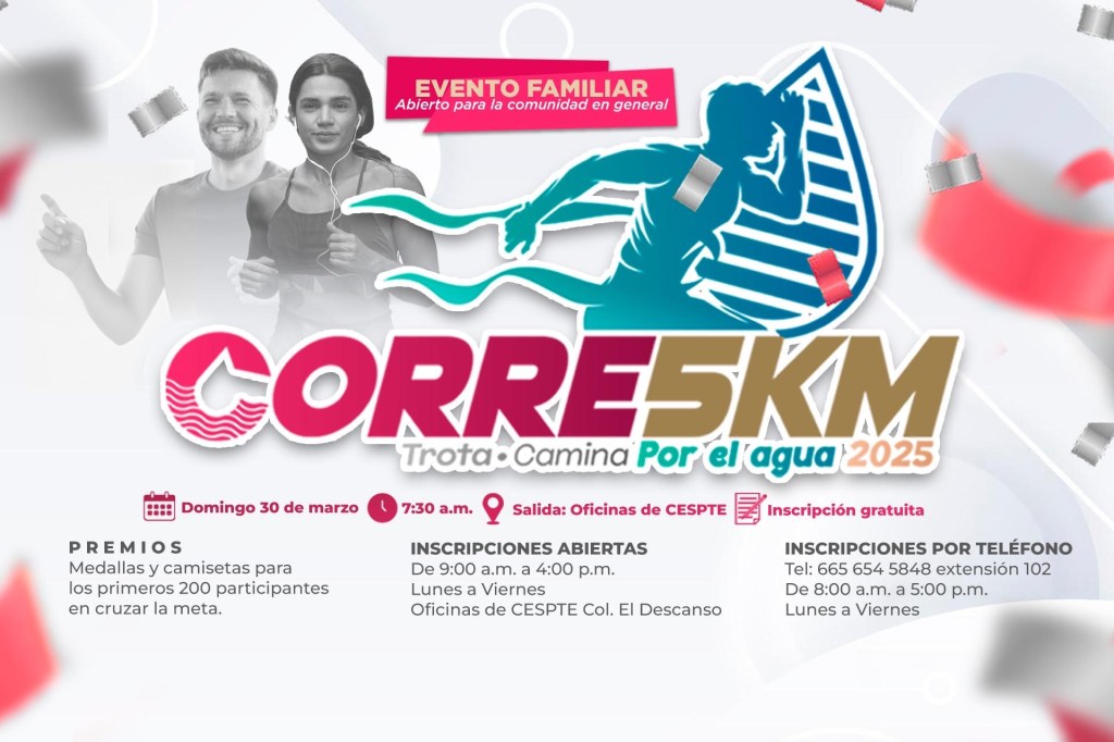 El evento, que forma parte de los esfuerzos institucionales para fomentar el cuidado y reúso del agua, tiene como punto de partida las oficinas centrales de CESPTE (colonia El Descanso, calle Misión de San Francisco s/n). Los participantes podrán elegir entre correr, trotar o caminar los 5 kilómetros de recorrido.