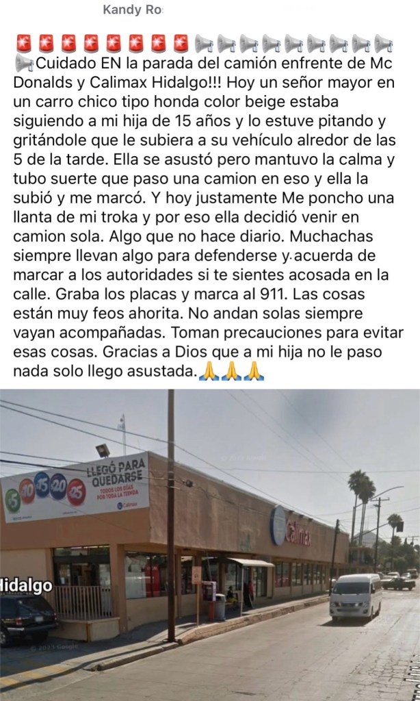 📍UNA MADRE DE FAMILIA DENUNCIA EN REDES SOCIALES UN POSIBLE CASO DE ACOSO EN LA PARADA DE CAMIÓN FRENTE A MCDONALD’S Y CALIMAX HIDALGO, DONDE UNA JOVEN DE 15 AÑOS FUE SEGUIDA POR UN HOMBRE MAYOR A BORDO DE UN AUTOMÓVIL COMPACTO, COLOR BEIGE, POSIBLEMENTE UN HONDA.
