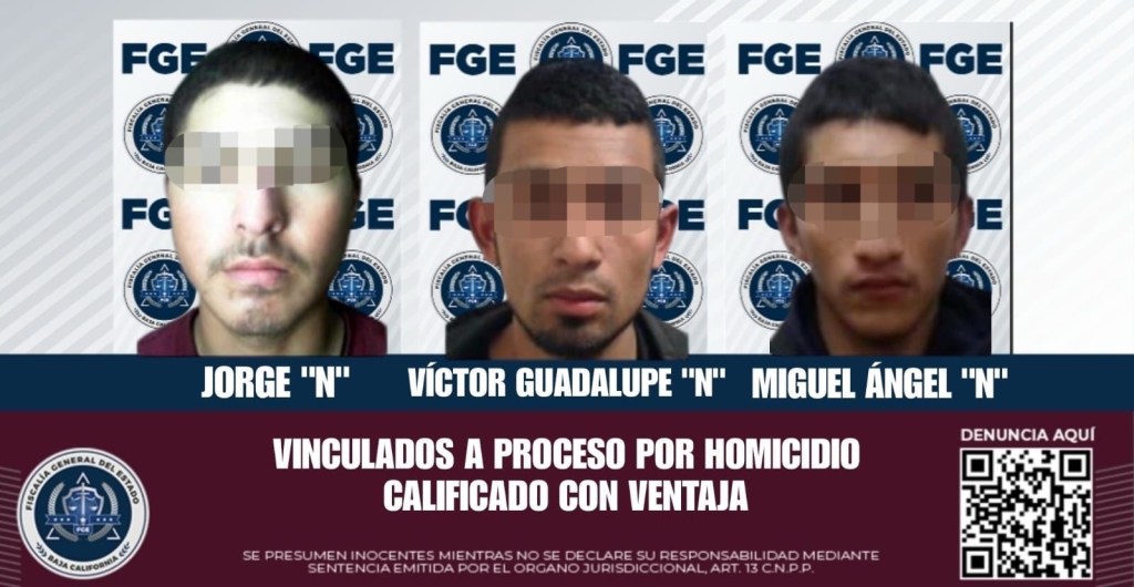 Los acusados Miguel Ángel “N” alias “El Micky”, Jorge “N” alias “El Patas Cortas” y Víctor Guadalupe “N” alias “El Banby” o “El Bambam”, presuntamente participaron en el asesinato de un hombre el pasado 23 de marzo de 2024 en Tijuana.
