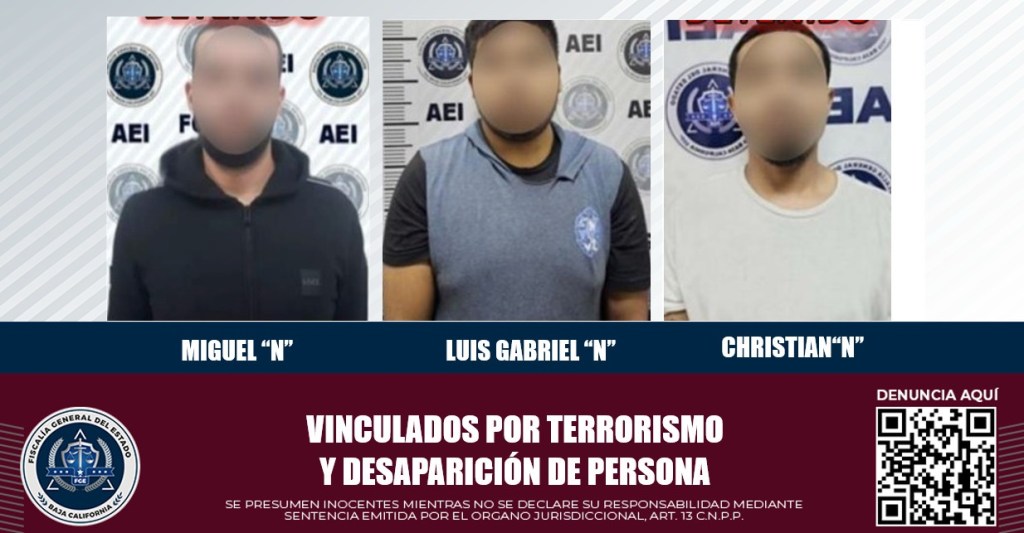 En cumplimiento de su compromiso con la seguridad y el bienestar de los ciudadanos de Baja California, la Fiscal General del Estado, Dra. Ma. Elena Andrade Ramírez, informó sobre la vinculación a proceso de tres individuos acusados de los delitos de terrorismo y desaparición de persona, relacionado con lo ocurrido el 25 de febrero de 2025, cuando se recibió un reporte a través de la línea de emergencia informando el hallazgo de restos humanos junto con un mensaje escrito en un puente ubicado en la Colonia La Gloria de Tijuana.