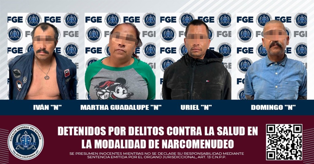 TECATE, BAJA CALIFORNIA, 4 DE ABRIL 2025.- La Fiscalía General del Estado (FGE), a través de la Fiscalía Regional de Tecate, informa sobre la detención de cuatro personas por su presunta responsabilidad en delitos contra la salud en la modalidad de narcomenudeo.