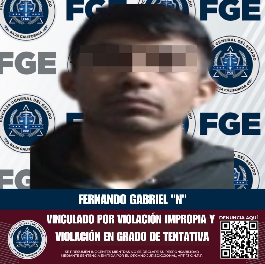 TIJUANA, BAJA CALIFORNIA, 12 DE ABRIL DE 2025. La Fiscalía General del Estado de Baja California (FGEBC), a través de la Unidad de Investigación Especializada en Delitos Sexuales, adscrita a la Fiscalía Especializada en Delitos Contra Mujeres por Razón de Género, informa sobre la vinculación a proceso penal de Fernando Gabriel “N”, por su presunta responsabilidad en la comisión de los delitos de violación impropia y violación en grado de tentativa.