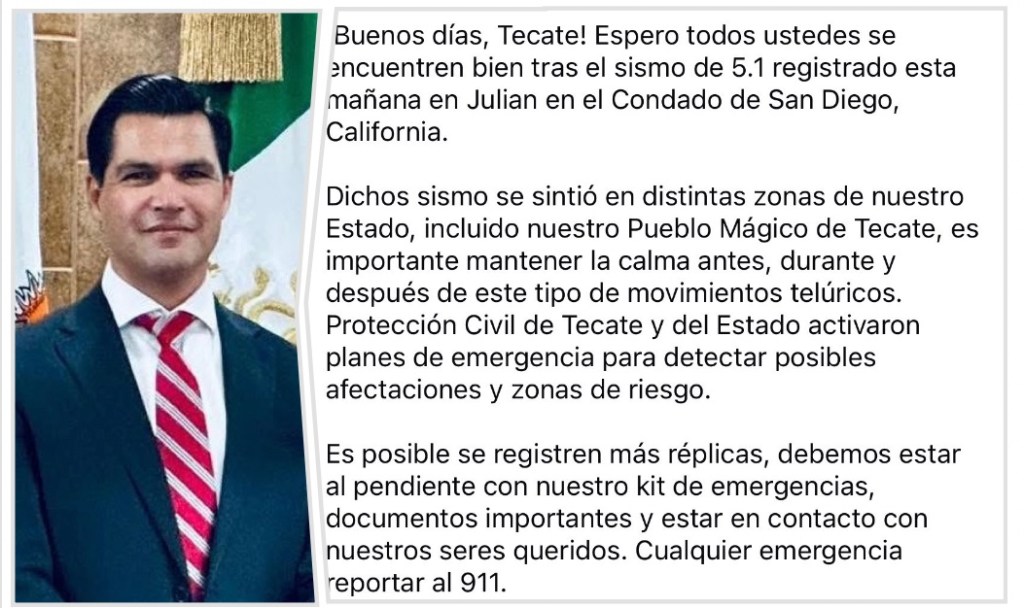 ¡Buenos días, Tecate! Espero todos ustedes se encuentren bien tras el sismo de 5.1 registrado esta mañana en Julian en el Condado de San Diego, California.
