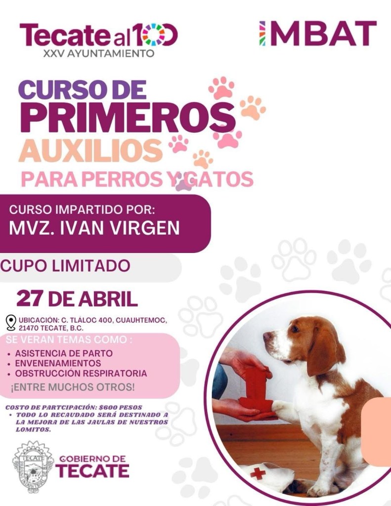 TECATE, B.C., ABRIL DE 2025 – EL GOBIERNO DE TECATE, A TRAVÉS DEL INSTITUTO MUNICIPAL DE BIENESTAR ANIMAL (IMBAT), INVITA A LA COMUNIDAD AL “CURSO DE PRIMEROS AUXILIOS PARA PERROS Y GATOS”, QUE SE REALIZARÁ EL PRÓXIMO 27 DE ABRIL.