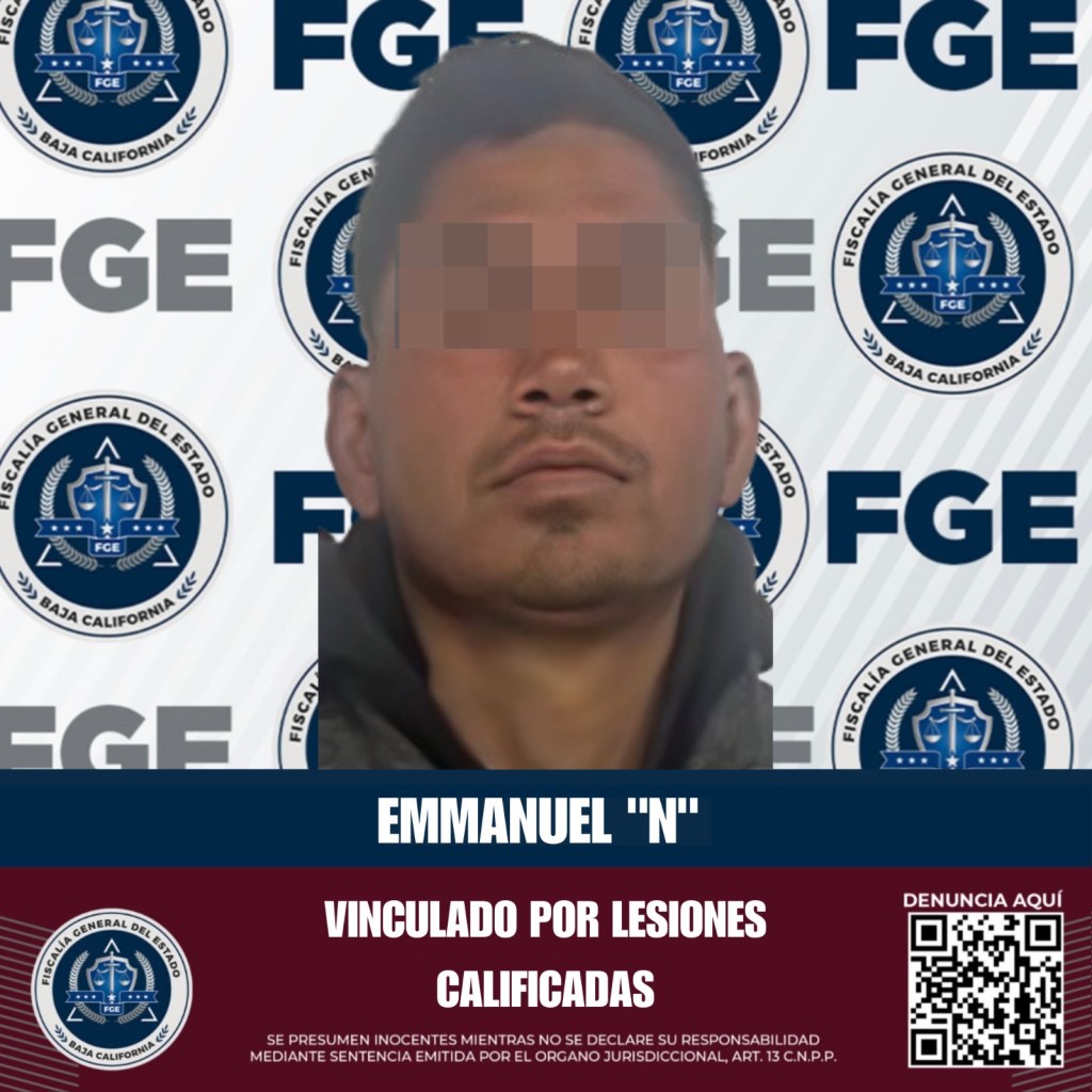 TECATE, BAJA CALIFORNIA A 7 DE MAYO DE 2025.- La Fiscalía Regional de Tecate, gracias al trabajo de recopilación de datos de prueba de la Unidad de Investigación con Detenido, logró obtener la vinculación a proceso en contra de Emmanuel “N”, por su presunta responsabilidad en el delito de lesiones calificadas.