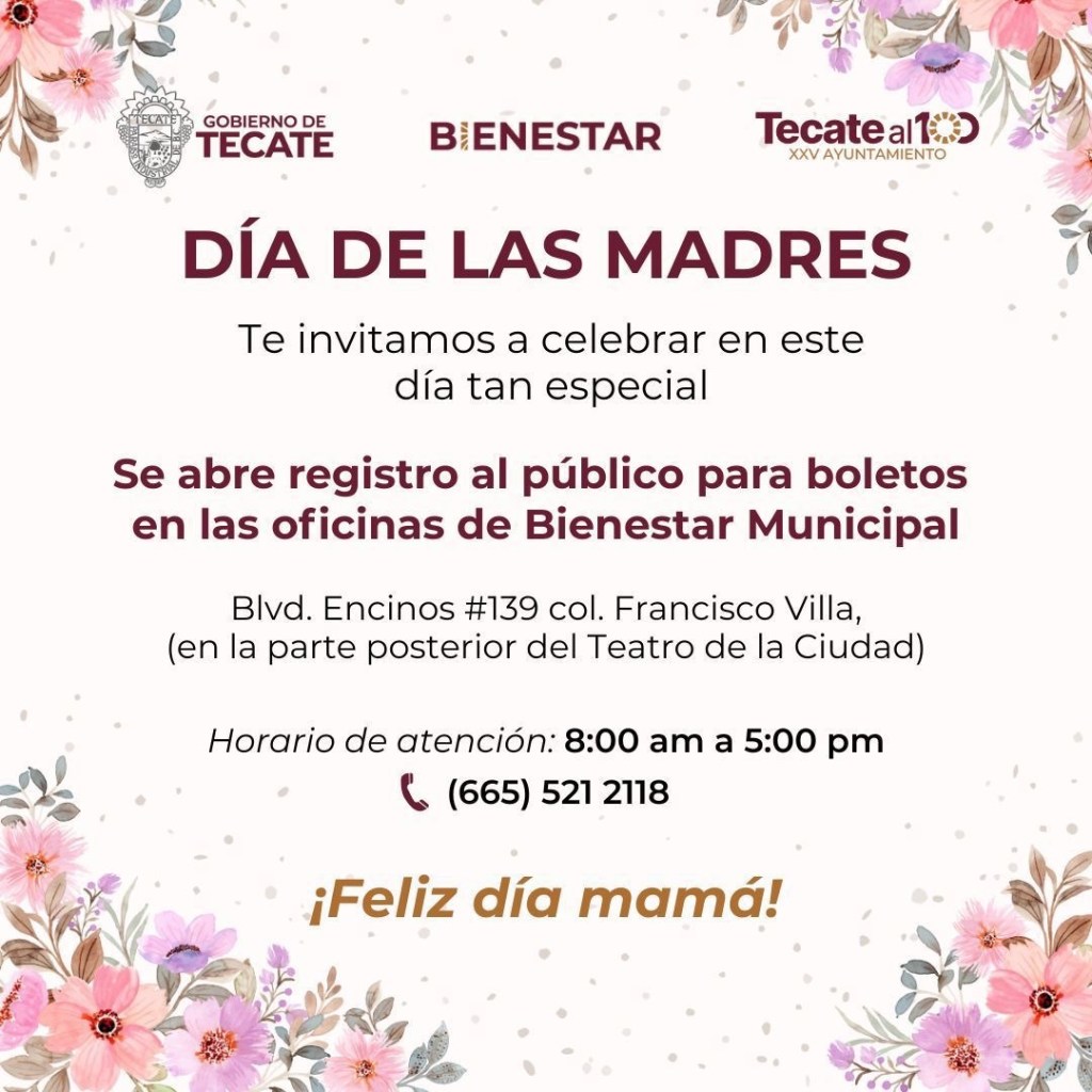 En el marco del Día de las Madres, el Gobierno de Tecate, a través de la Dirección de Bienestar Municipal, lanza una convocatoria abierta al público para registrarse y obtener boletos para el evento conmemorativo que se llevará a cabo en honor a todas las mamás tecatenses.