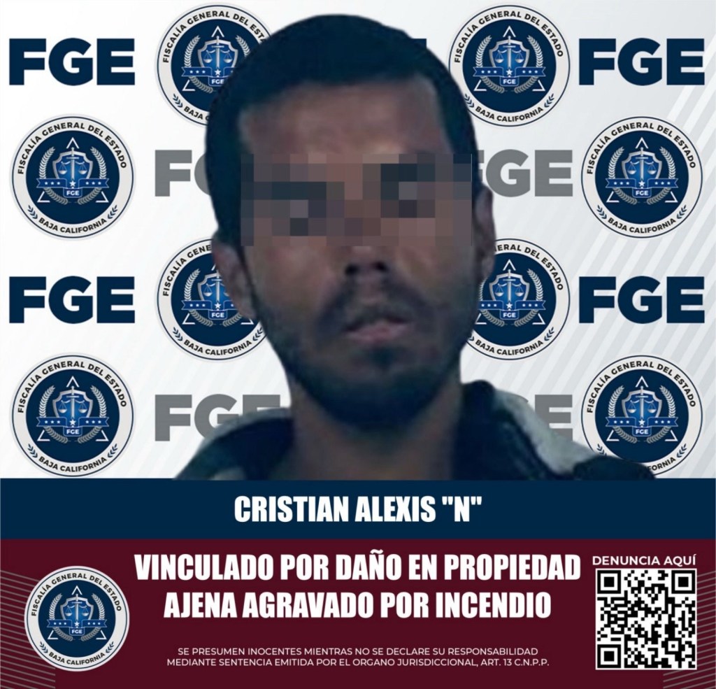 TECATE, BAJA CALIFORNIA A 18 DE MAYO DE 2025.- La Unidad de Investigación con Detenido, adscrita a la Fiscalía Regional de Tecate, logró recabar suficientes datos de prueba contundentes en contra de Cristian Alexis “N”, por el delito de daño en propiedad ajena agravado por incendio.
