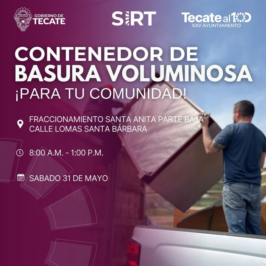 El Gobierno Municipal a través del Sistema Integral de Residuos de Tecate (SIRT) anunció que este sábado 31 de mayo se llevará a cabo una nueva jornada de limpieza con la instalación de contenedores para basura voluminosa en dos puntos clave de la ciudad.