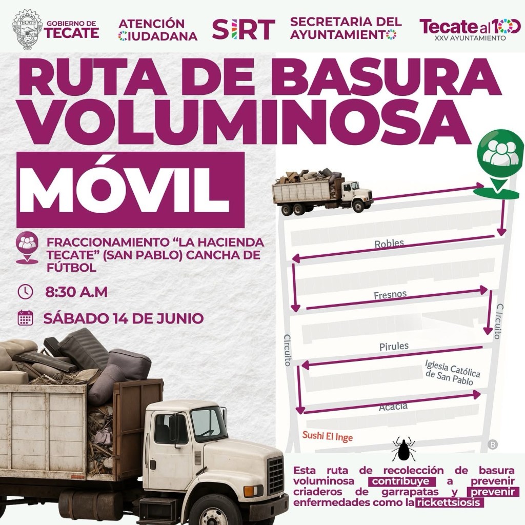 Este sábado 14 de junio a partir de las 8:30 A.M., estaremos recorriendo el Fraccionamiento La Hacienda Tecate (San Pablo).