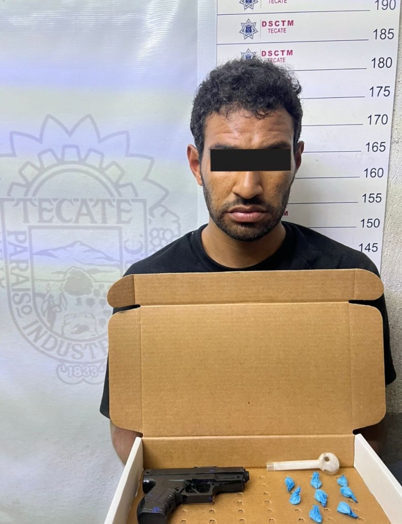Tecate, B.C., 11 de junio de 2025.– Elementos de la Dirección de Seguridad Ciudadana y Tránsito Municipal de Tecate(DSCTM) al realizar su recorrido de prevención. y vigilancia, detuvieron a un sujeto en posesión de presunta droga y un arma de utilería,en la colonia Loma Alta sobre el bulevar Nuevo León, a la altura del bordo del río, en la parte posterior de Plaza Encinos.