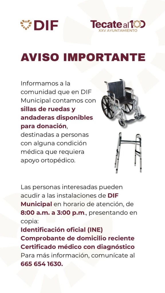 Tecate, Baja California a 16 de junio de 2025.– Reafirmando su compromiso con el bienestar y la inclusión social de los sectores más vulnerables, el Sistema para el Desarrollo Integral de la Familia (DIF) de Tecate informa a la ciudadanía sobre la disponibilidad de apoyos ortopédicos, como sillas de ruedas y andaderas, para su entrega gratuita a personas que presenten una condición médica que limite su movilidad.