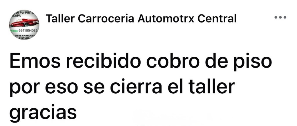 📌UN TALLER DE CARROCERÍA DE TIJUANA ANUNCIÓ SU CIERRE DEFINITIVO LUEGO DE SER VÍCTIMA DE EXTORSIÓN POR PARTE DE PRESUNTOS CRIMINALES, EL HECHO FUE DADO A CONOCER A TRAVÉS DE UNA BREVE PERO CONTUNDENTE PUBLICACIÓN EN REDES SOCIALES.