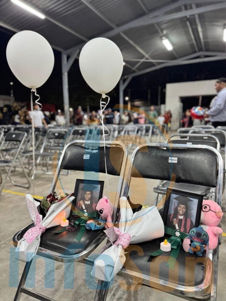 📍LAS SILLAS DONDE DEBIERON RECIBIR SU DIPLOMA ESTABAN OCUPADAS POR SUS FOTOGRAFÍAS, FLORES Y VELAS, HOY NO HUBO GRITOS DE EMOCIÓN, SINO UN DOLOROSO MINUTO DE SILENCIO Y APLAUSOS QUE ROMPIERON EL CORAZÓN DE TODOS.