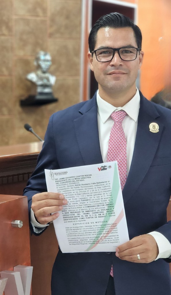 MEXICALI A AGOSTO DEL 2025.- El diputado del PRI, Humberto Valle, presentó ante el Pleno del Congreso Local un exhorto dirigido al Comisario Héctor Jiménez Báez, Coordinador Estatal de la Guardia Nacional y Comandante de la 2ª Brigada de Policía Militar, para reforzar de manera inmediata la vigilancia en el tramo carretero Tecate–Ensenada, específicamente entre los kilómetros 72 y 90, así como en otros puntos identificados como de riesgo.