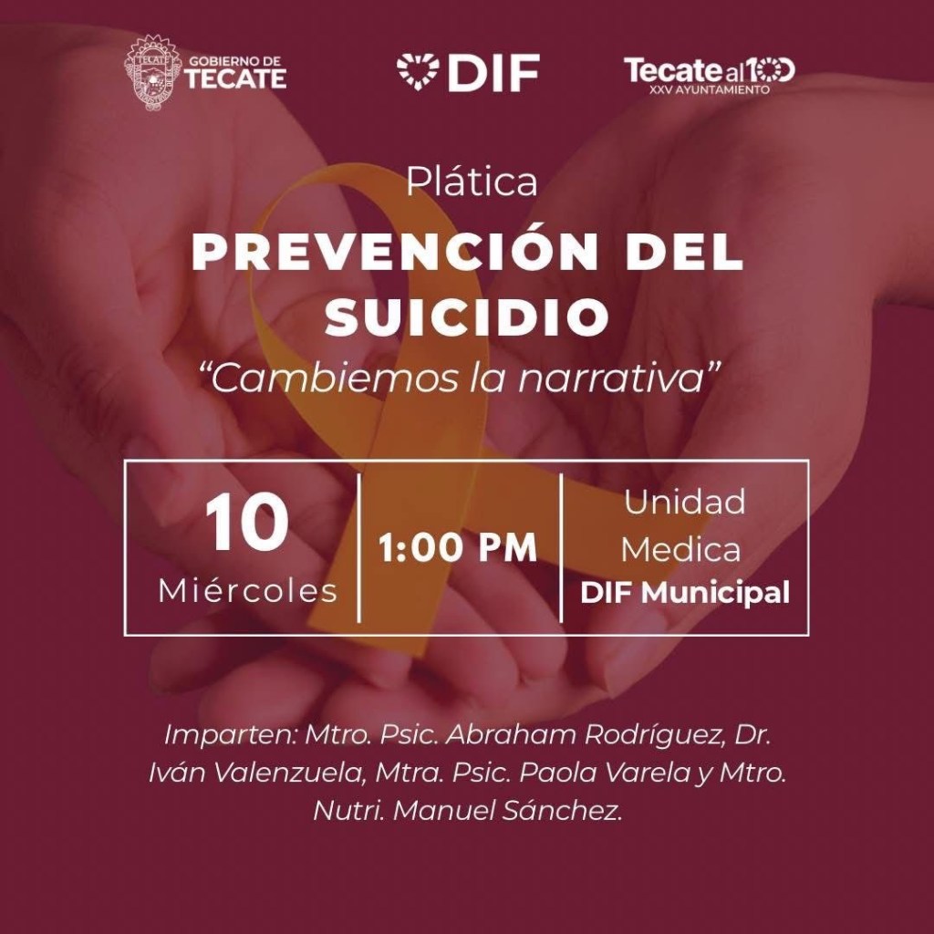 Tecate, Baja California a 05 de septiembre de 2025.- En el marco del Mes de la Prevención del Suicidio, el Sistema para el Desarrollo Integral de la Familia (DIF) Tecate, a través de su Unidad Médica, hace una atenta invitación a la comunidad a participar en la plática “Prevención del Suicidio: Cambiemos la Narrativa”, que se llevará a cabo el próximo miércoles 10 de septiembre a la 1:00 p.m. en las instalaciones de la Unidad Médica DIF.