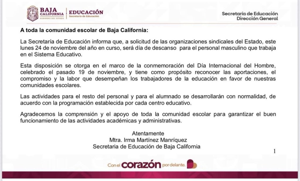 La Secretaría de Educación, informa que, a solicitud de las organizaciones sindicales del Estado, este lunes 24 de noviembre del año en curso, será día de descanso para el personal masculino que trabaja en el Sistema Educativo.