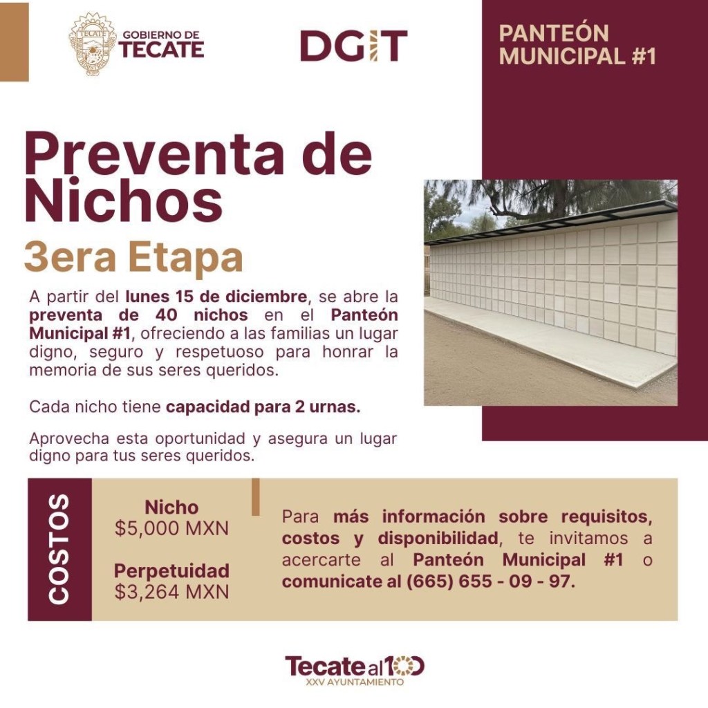 Tecate, B.C. a 15 de diciembre de 2025.— El Gobierno de Tecate informa a la ciudadanía que, a partir de este lunes 15 de diciembre, se encuentra abierta la preventa de la tercera etapa de nichos en el Panteón Municipal #1, con un total de 40 espacios disponibles, como parte del compromiso por brindar a las familias tecatenses alternativas dignas, seguras y respetuosas para honrar la memoria de sus seres queridos.