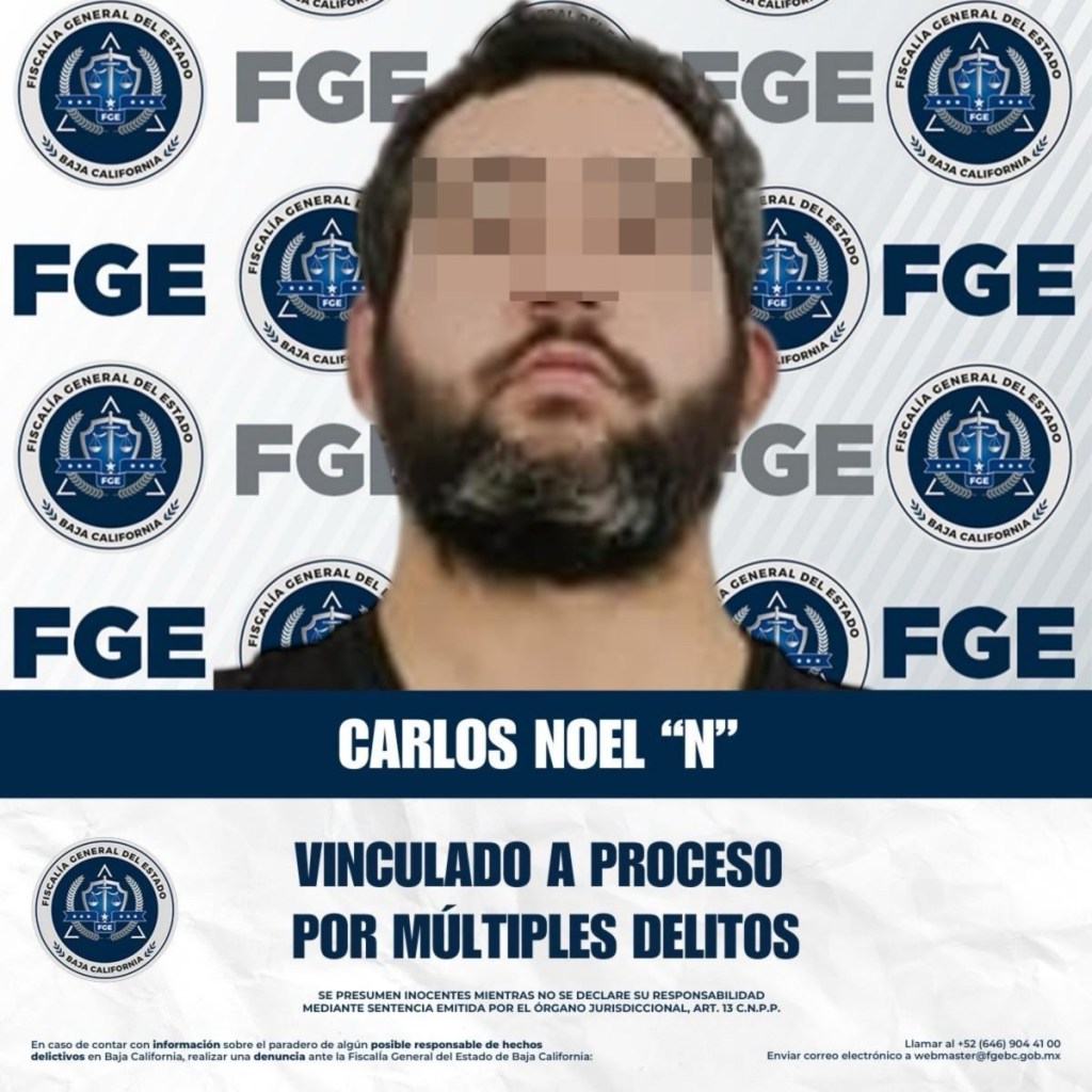 TECATE, BAJA CALIFORNIA, A 6 DE ENERO DE 2026.- Bajo las directrices de la Dra. Ma. Elena Andrade Ramírez, la Fiscalía Regional de Tecate informa que se obtuvo la vinculación a proceso, imponiéndose la medida cautelar de prisión preventiva justificada, en contra de Carlos Noel “N”, por su presunta responsabilidad en los delitos de robo equiparado de vehículo de motor (uso de vehículo con reporte de robo), narcomenudeo por posesión de cannabis sativa, indica o marihuana, narcomenudeo por posesión de metanfetamina, balizaje, portación de arma prohibida (estrellas ponchallantas) y un delito de carácter federal por la posesión de cartuchos útiles.
