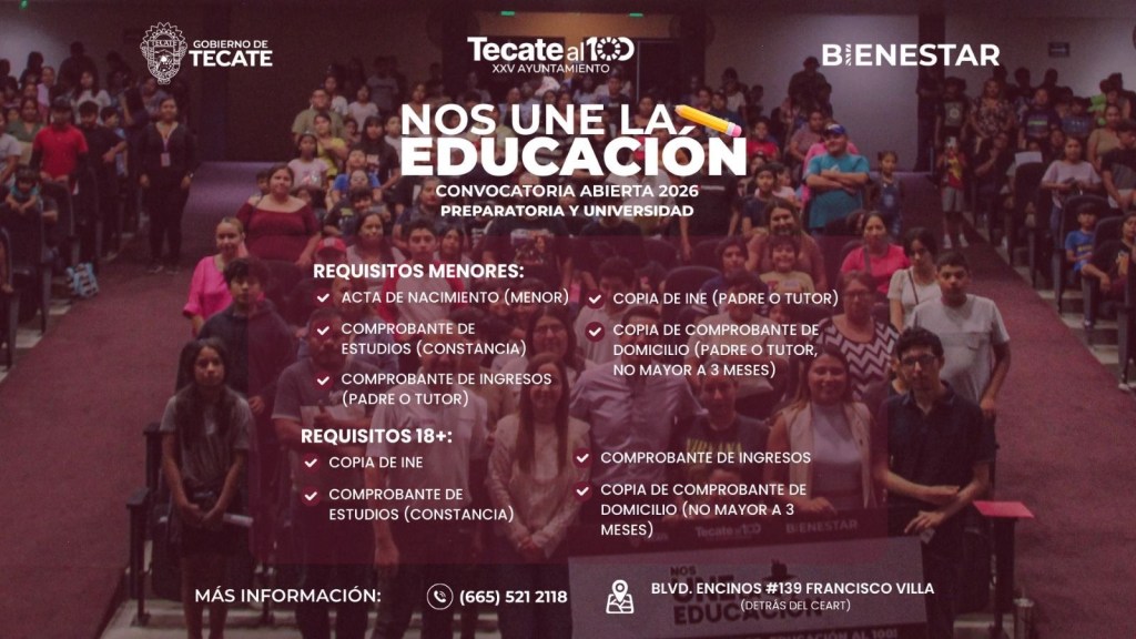 Tecate, Baja California a 08 de enero de 2026.– Reafirmando su compromiso con el impulso a la educación y el bienestar de las familias tecatenses, el Gobierno de Tecate, a través de Bienestar Municipal, invita a la comunidad estudiantil a participar en la convocatoria 2026 del programa de becas “Nos Une la Educación”, dirigido a estudiantes de nivel preparatoria y universidad.
