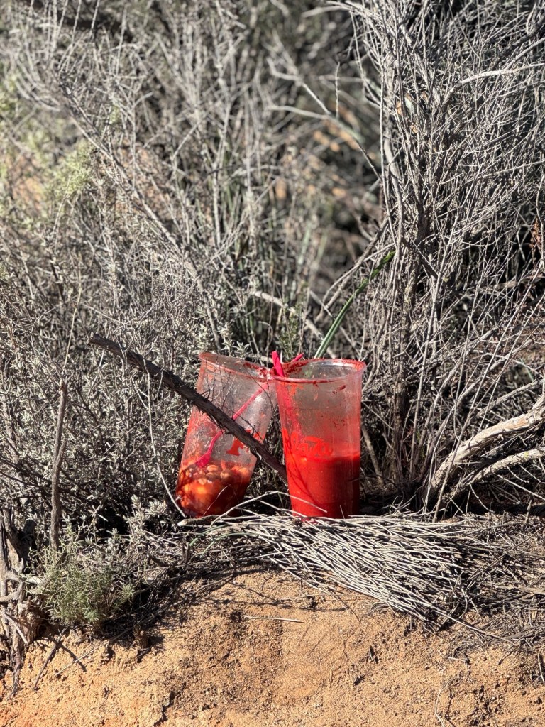 TECATE || EN EL CAMPO DE PIEDRA UNA PAREJA DE CHISTOSITOS DEJÓ ESOS VASOS CON CHAMOY POR SI SE LE ANTOJA A LOS ANIMALITOS