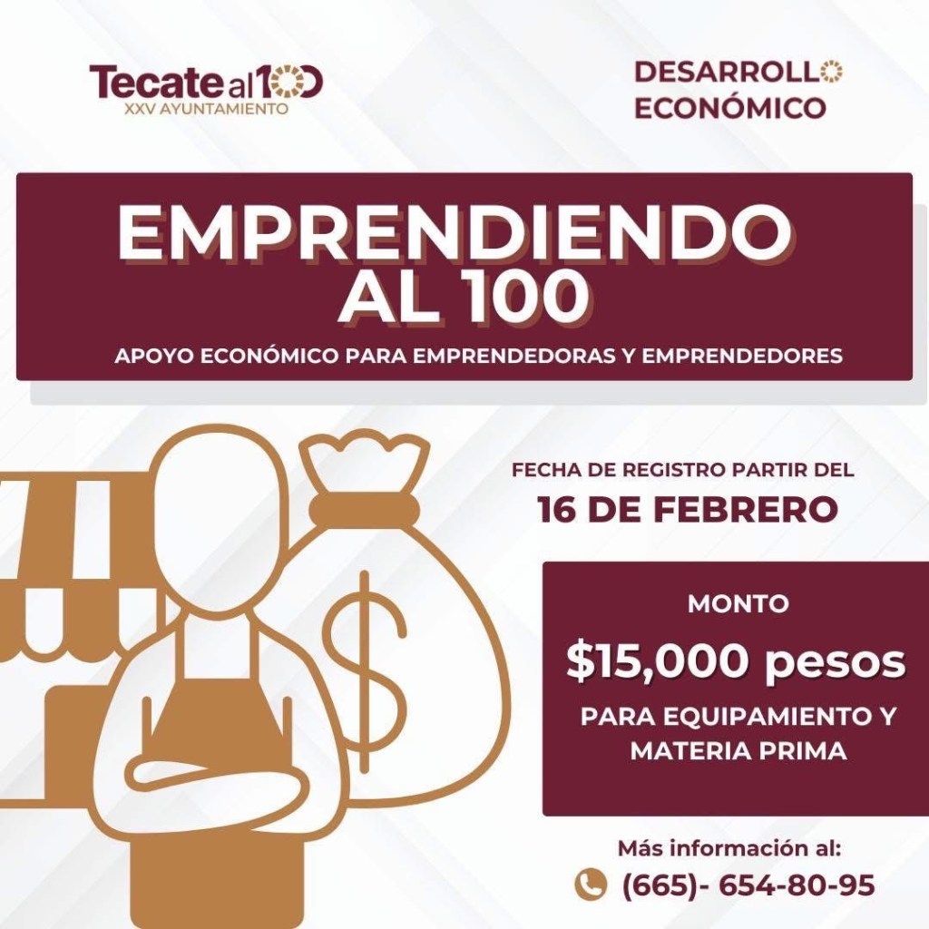 Tecate, Baja California a 16 de febrero de 2026.- Para fortalecer la economía local y respaldar a quienes apuestan por el autoempleo y la generación de oportunidades, el Gobierno de Tecate, a través de la Dirección de Desarrollo Económico, anunció la apertura de la convocatoria del programa “Emprendiendo al 100”, dirigido a emprendedoras y emprendedores del municipio.