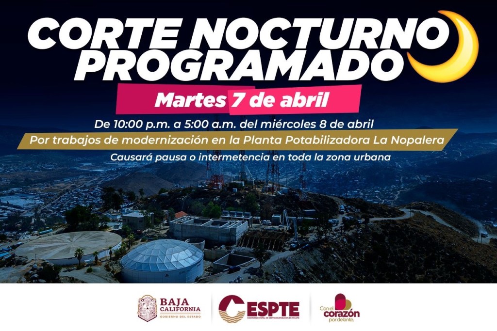 TECATE.- La Comisión Estatal de Servicios Públicos de Tecate (CESPTE) informa a la comunidad que, como parte de los proyectos estratégicos de mejora en la infraestructura hídrica, se llevará a cabo un corte programado en el suministro de agua potable el próximo martes 7 de abril. Esta interrupción temporal es necesaria para ejecutar trabajos críticos de interconexión dentro del proceso de modernización de la Planta Potabilizadora «La Nopalera», una obra clave para optimizar la capacidad de respuesta y calidad en el servicio que se brinda a las familias tecatenses.